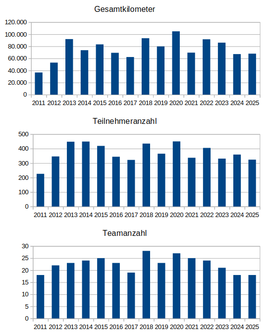 Aber zurück nach Weßling: 2012 wurde mit 53.047 km erstmals mehr als einmal der Äquator umrundet, und 2020 erreichten wir trotz oder vielleicht auch wegen Corona unser bisheriges Spitzenergebnis von 104.824 km. Insgesamt kamen in den 15 Jahren 1.130.157 Fahrradkilometer von 5.560 Radfahrer:innen zusammen. Das entspricht immerhin der Vermeidung von etwa 18,5 t CO2. Die Radlerinnen und Radler fanden sich dazu in verschiedenen Teams zusammen, vom Seriensieger DLR über die Grundschule (heuer auf Platz zwei!) bis hin zu den Teams der Feuerwehren oder Familien und Nachbarschaftsgruppen.